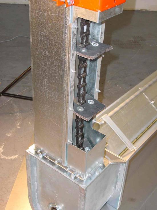 - Elevator input can be completely closed off with a valve, also from the receiving pit screw transporter, therefore, the bucket elevator can be completely emptied also when the receiving pit is still full.